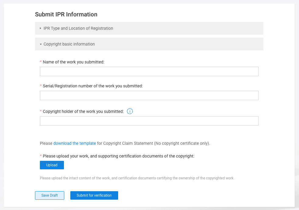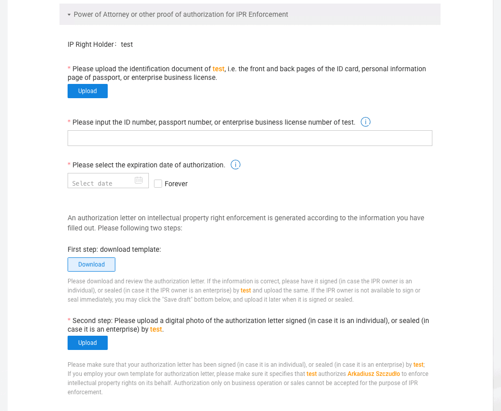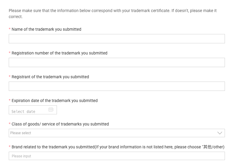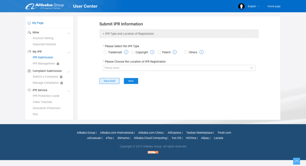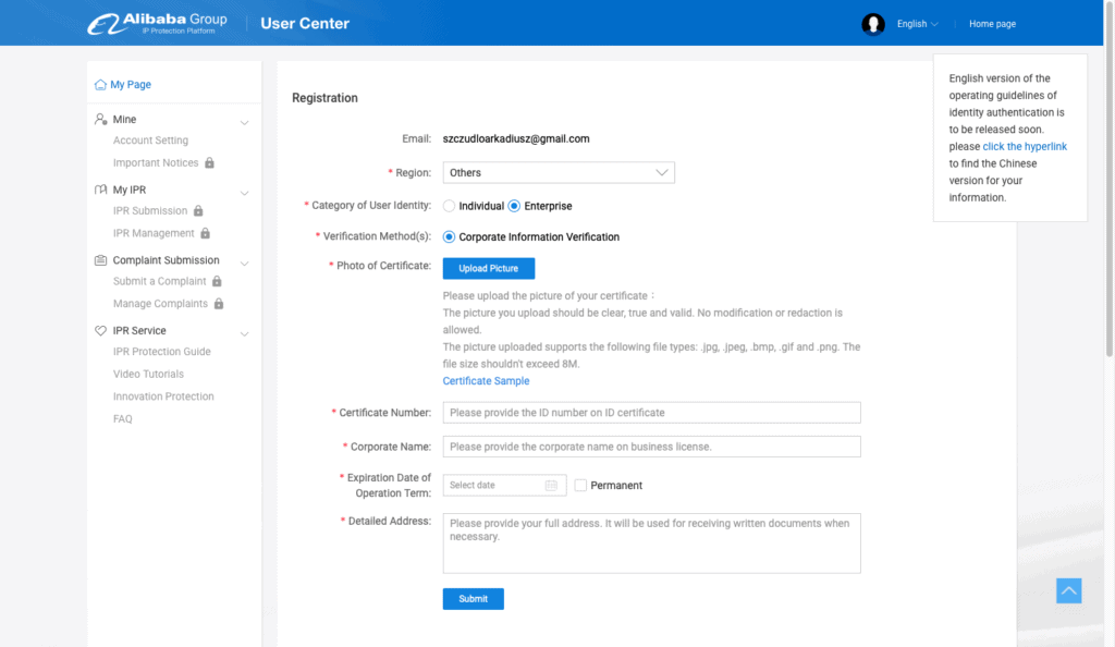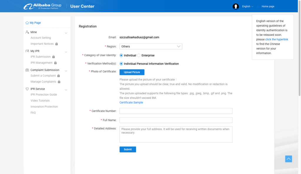 Kiedy dodane przez Ciebie prawo zostanie zatwierdzone, będziesz mógł przejść do składania skarg związanych z jego naruszeniem. W tym celu powinieneś wejść w zakładkę “Submit a Complaint”, a następnie wybrać platformę należącą do grupy Alibaba, na której dochodzi do naruszeń. Kolejny krok to wypełnienie właściwej skargi o następujące informacje: