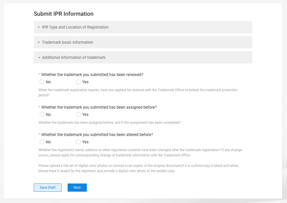 Jeżeli wybrałeś wariant “Patent”, procedura jego dodawania na platformę przebiega podobnie, jak w przypadku znaku towarowego (“Trademark”).