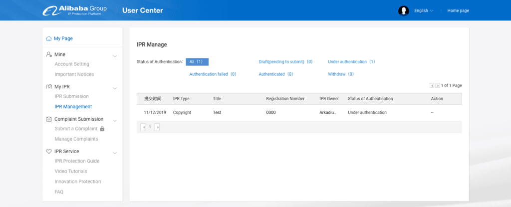 Po przejściu całej procedury, status zgłoszonych praw możesz sprawdzać w zakładce służącej do zarządzania nimi (“IPR Manage”). Jeżeli zgłoszenie nie zostanie zaakceptowane, otrzymasz wiadomość e-mail z opisem braków wraz z linkiem do panelu, w którym będziesz mógł je uzupełnić.
